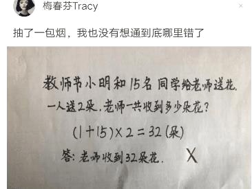 “一人送两朵”是指小明和15名同学买了N朵花,给每位老师送两朵