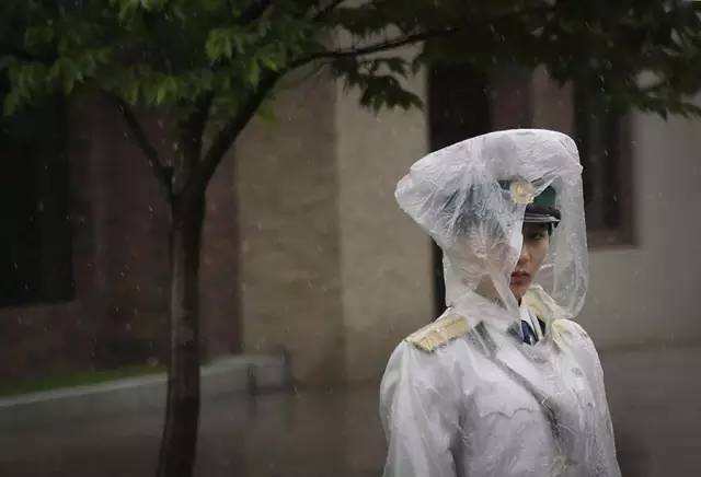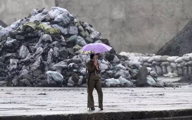 雪中的女兵正在站岗,让人侧目的是那粉色的雨伞和10厘米的高跟鞋。可能朝鲜女兵穿高跟鞋并不违反规定,因为阅兵时她们的高跟鞋也有4寸高。