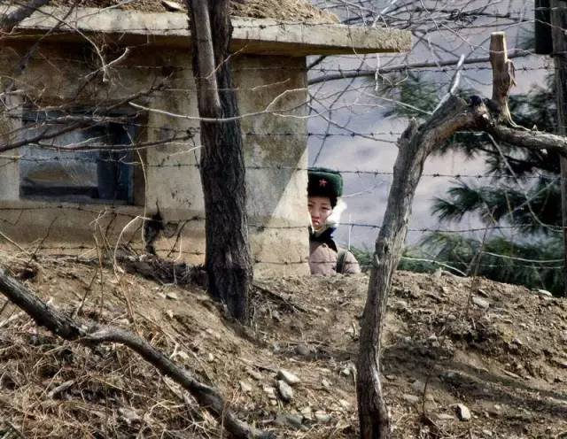 朝鲜鸭绿江畔,一名哨所的女兵正在站岗。