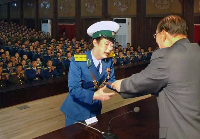 朝鲜一位女交警因为保护首长立功,被授予朝鲜最高荣誉"共和国英雄"称号,颁奖现场,她激动地嚎啕大哭。