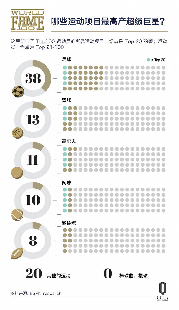 一个需要注意的细节是,如果只看排名 Top 20 的超级巨星,那这张图表的排序就要换一换了。“网球”成为了拥有 Top 20 选手最多的运动,足球和高尔夫并列第二,橄榄球则无人入选 Top 20。