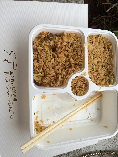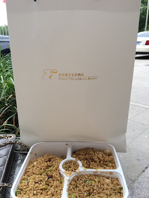 我跟她们一起进餐,人谈事我知道我是不便同行的,就婉拒了,在车库等她们回程时给领导助理发了一微信,让她帮我随便打包个便餐就好了!结果打回来我就晕了~~这品相的炒饭竟然要三百多 味道更是毫无特色,随便一大妈都炒得比这好吃 后来得知她们四人几乎没有吃啥特色美食,包括这炒饭花了小八千元~~难道环境值得这价?