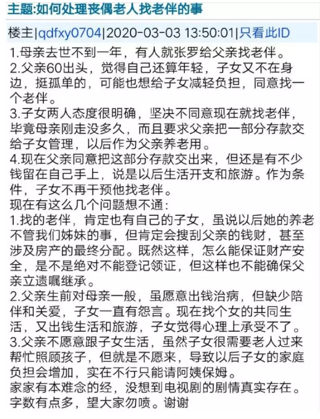 回到文首的那个帖子,其实我能理解楼主姐妹的焦虑,父亲重组家庭确实会有财产流失的风险。你一个60多岁的老头,在婚恋市场上大概唯一的优点就是有钱。