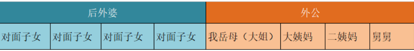 她的外婆几十年前去世,外公续娶了一个。两边各有4个子女,家庭结构是这样的:
