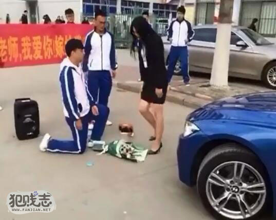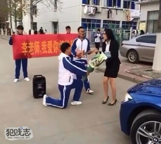 近日,网上曝出一名男学生向女老师求婚的视频。画面中,男生身穿校服捧着一束花单膝下跪。身后两名哥们拉出横幅,上面写着“李老师,我爱你!嫁给我吧!”。