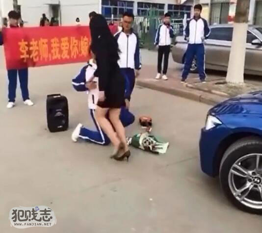 这名美女老师一脸惊讶,先是好言相劝,不断说着:“不要闹啦!我有男朋友了!”伸手欲将男生拉起。但男生不为所动,反而上衣口袋掏出钻戒献给老师。