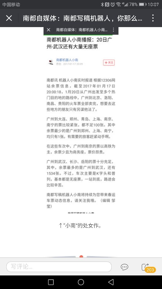 事实上,这篇春运报道是《南方都市报》写稿机器人“小南”上岗后的处女作。其背后的技术研发团队来自北京大学计算机科学技术研究所。