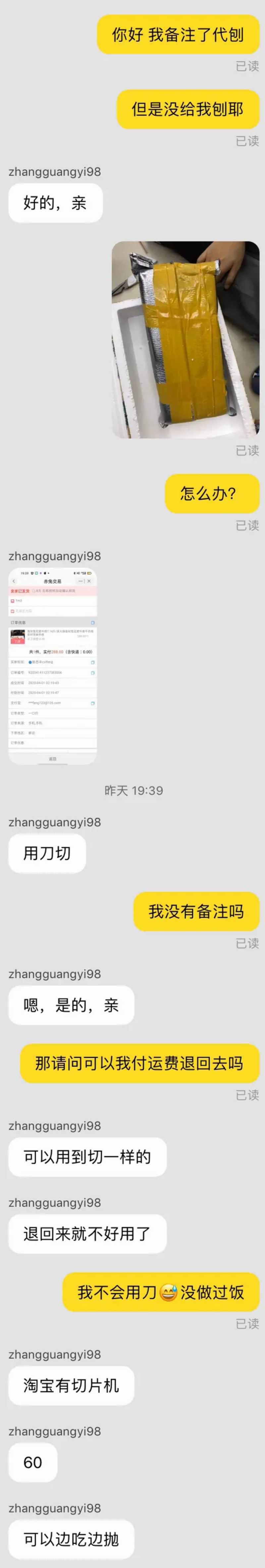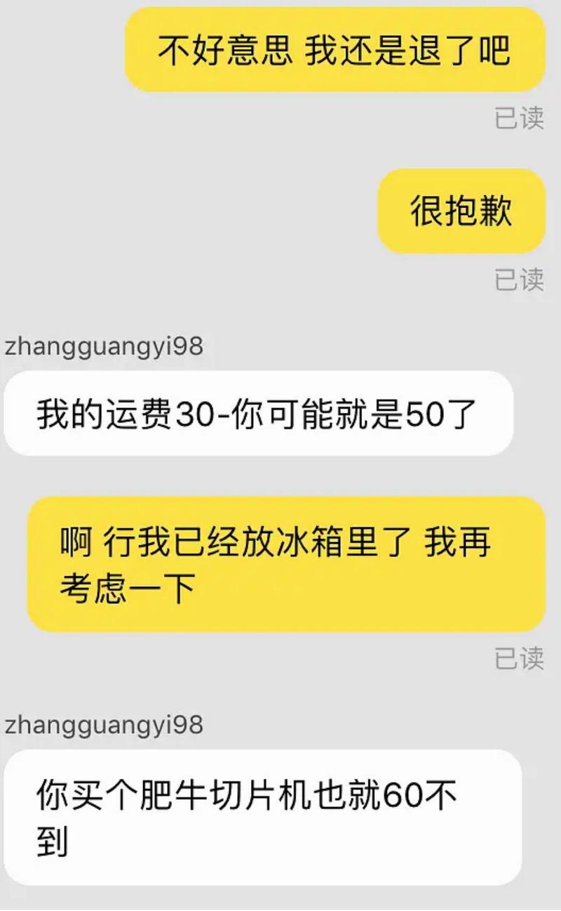 理论上店家有七天无条件退款的承诺,我肯定是可以退的。但这位店家言辞闪烁,显然不太愿意给我退货。考虑到冰鲜食品来回运输可能会变质,为了不让商家蒙受损失,我和我弟只能brain.storm,寻找更优解。
