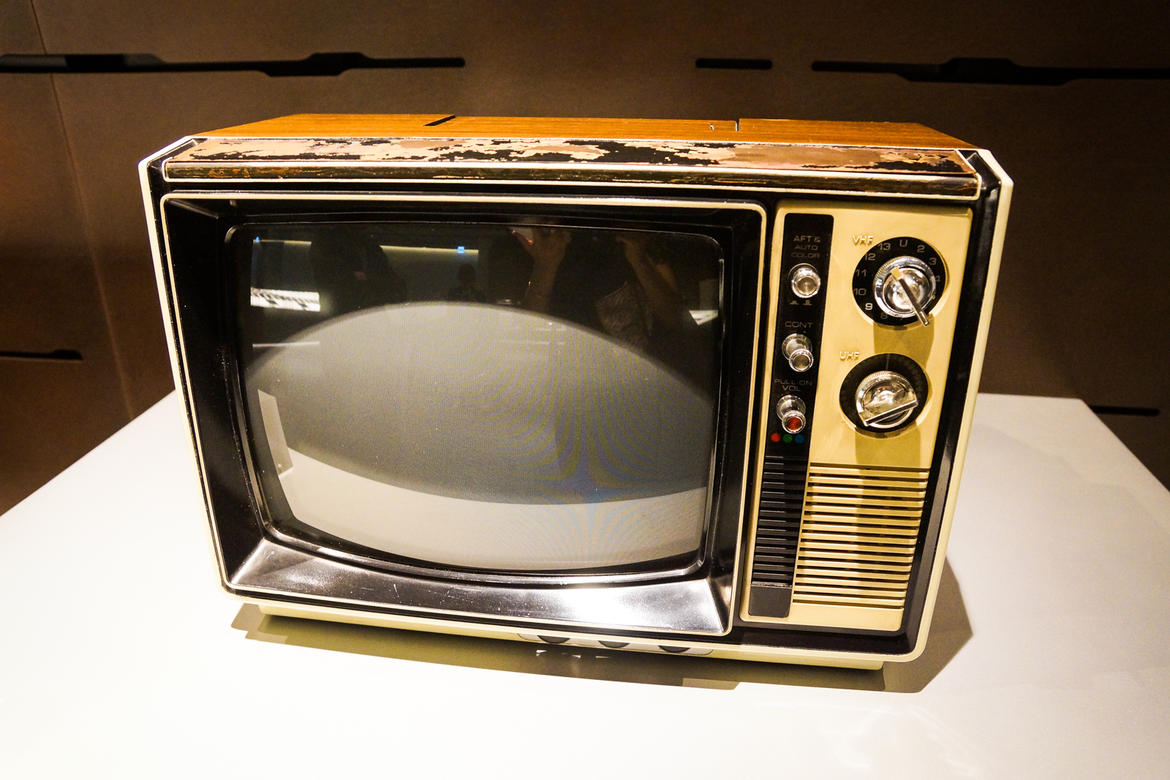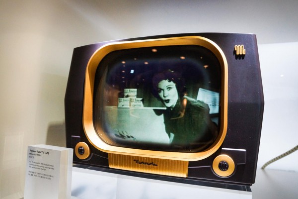 电视机.1927.年就诞生了,这款是.1950.年的摩托罗拉电视机,它使用真空管来控制内容,正面的按钮可以用来调节音量和选台。