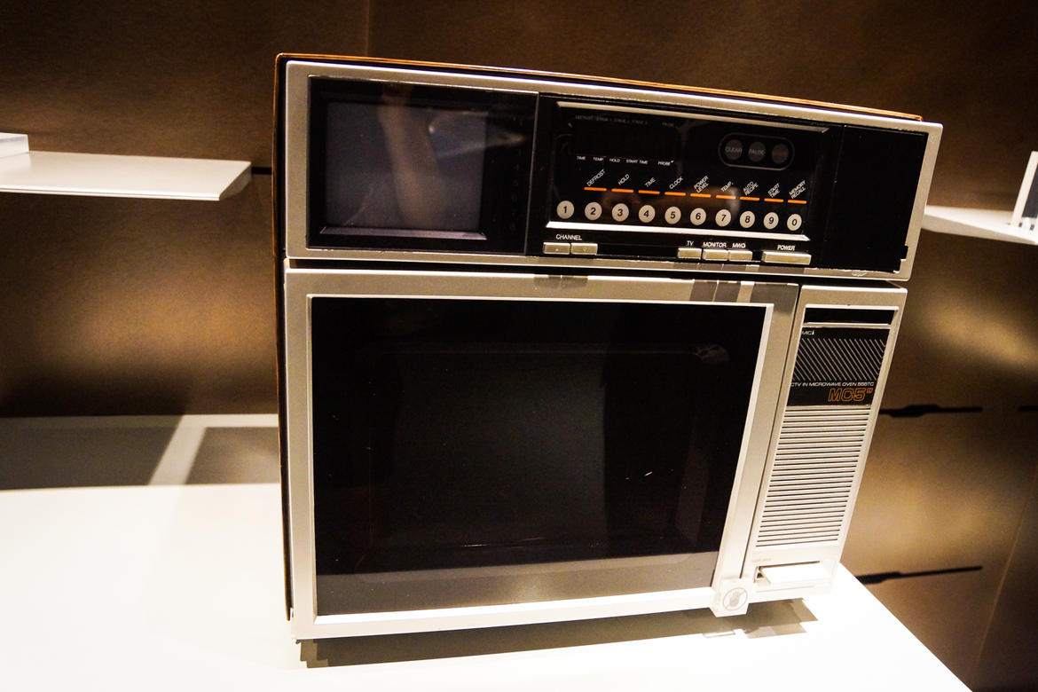 微波炉电视机,一边看电视,一边爆爆米花,人生好惬意,1983.年的生活。左上角那块5英寸的屏幕还能显示新闻。哇,碉堡了!