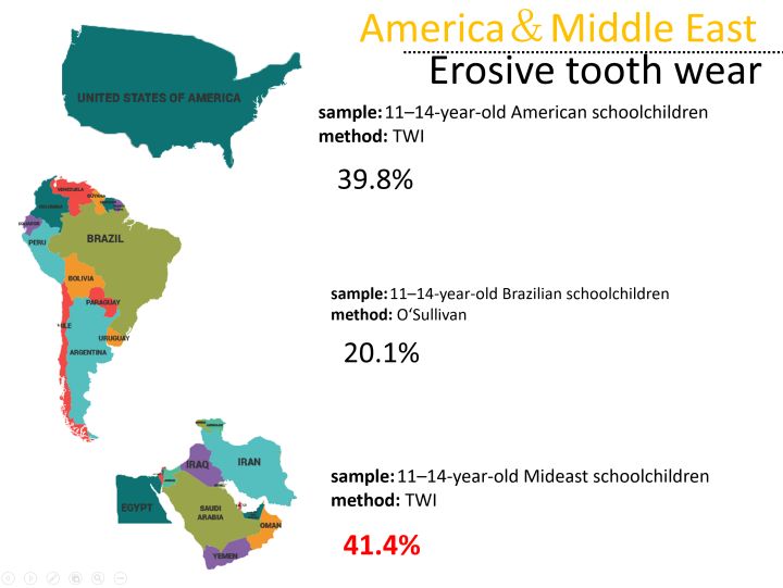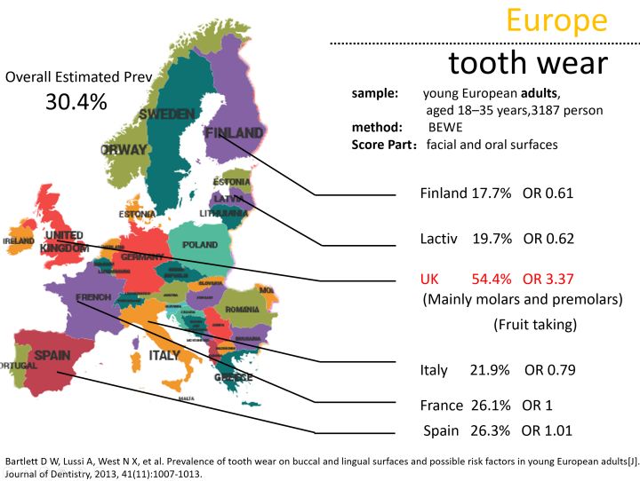 如图所示,这个是我依据相关文献总结的欧洲地区酸蚀症,尽管欧洲学派通常将酸蚀症归纳于牙齿磨耗之中,因此图示数据比实际情况偏大,但酸蚀是磨耗的重要始动因素,任何磨耗几乎都与酸蚀脱不了干系。