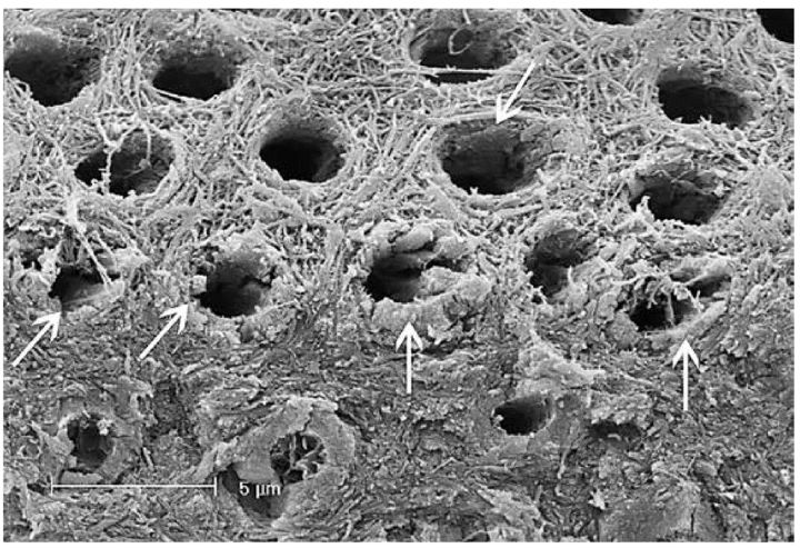 在酸蚀后,胶原纤维上结合的矿化物被溶解,胶原纤维网络疏松,并在机械力(比如刷牙)的条件下快速塌陷,形成致密的胶原纤维层,但很遗憾,失去矿物质加持的胶原纤维层宏观力学性能很差,将会被很快磨除,就像剥洋葱一样一层一层被拨开。