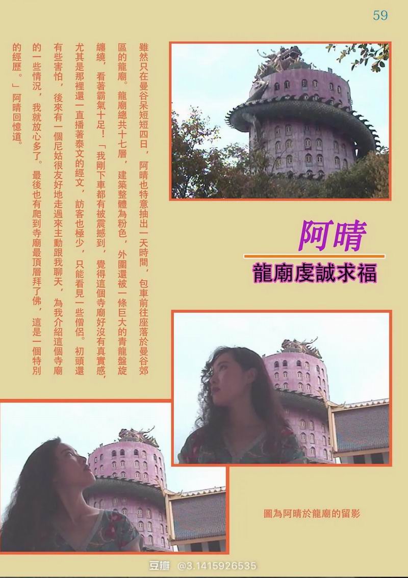淘宝500元订的包车一个人去的. 透过车窗看着这个粉红色被一条龙包裹着的“网红”奇异建筑从小慢慢变大,直到我就站在它脚下仰视着它,这种感觉真的挺奇妙. 寺庙里人很少,游客更是稀少,我去的时候就看见几个西方游客,还有一些僧侣。寺庙一直无限循环播放着泰国经文,让我置身于某种强烈的神秘宗教氛围里。刚开始还觉得有点害怕,因为里面的一些雕像的造型,你懂得~直到一个很友善的尼姑(讲台湾腔国语,估计是华人)主动走过来跟我聊天,向我介绍这个寺庙的概况,立马消除了我的恐惧感。