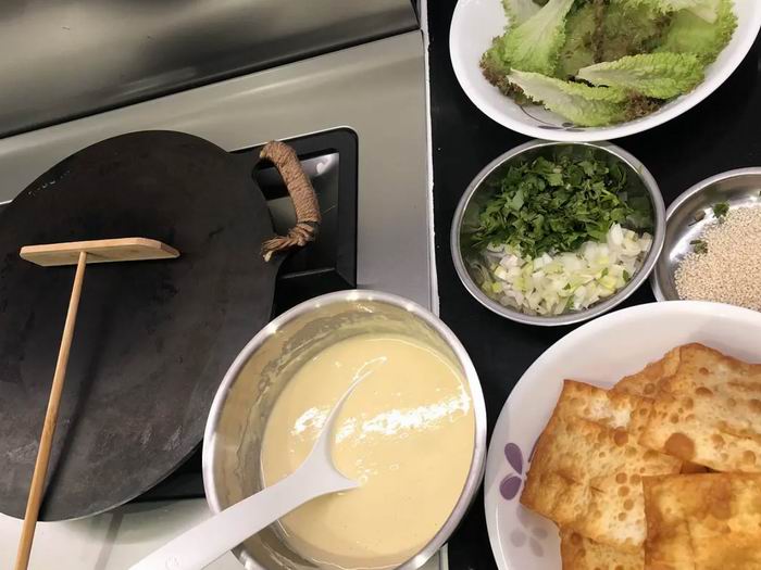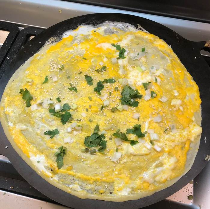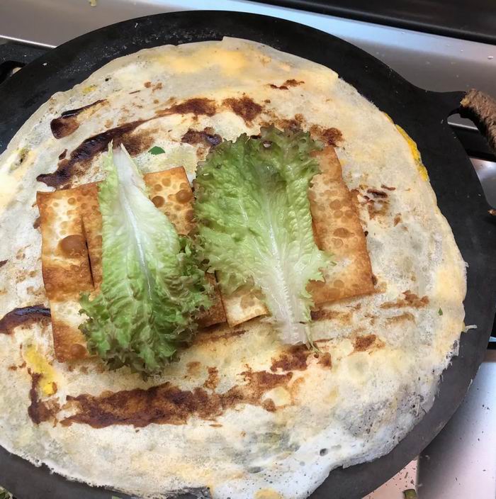 3.摊之前开小火把锅加热,锅热之后关火然后再放面糊开刮。加鸡蛋之后再开火,一定要小火