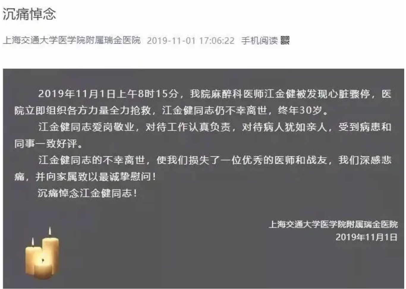在新闻里看到,上海交通大学医学院附属瑞金医院发布一则讣告称:2019年11月1日上午,麻醉科医师江金健被发现心脏骤停,抢救无效,不幸离世,终年30岁。