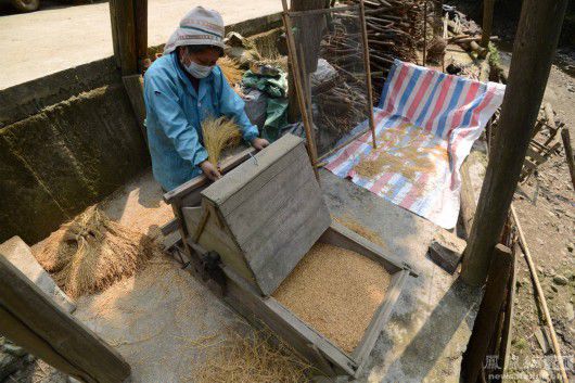 占里的祖先为躲避战乱,在600多年前从江苏逃难,途径广西梧州迁徙而来,他们溯都柳江而上,最后找寻到这块风水宝地定居下来。占里村的得名就来源于其祖先"吴占"和"吴里"。他们在这里开田辟地,过着自给自足而又富足的世外桃源般的生活。不知从什么时候,占里人从最初的几户人家,很快发展到了100多户。人口的急剧增长,四周的山林也被全部开垦,原本和睦的大家庭开始出现了各种各样的矛盾和争斗。图为一名妇女在打谷子。村里人过着自给自足的田园生活。