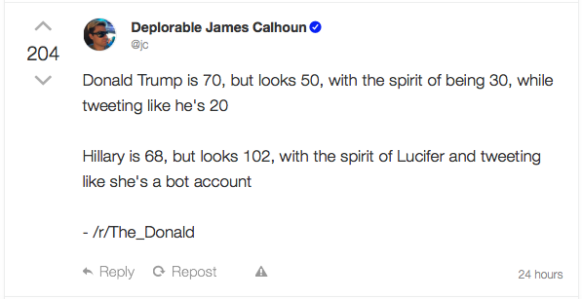 虽然 Torba 这么说了,但 Gab 用户的政治倾向还是非常明显,那就是白人至上主义、支持川普、反对希拉里和仇视少数族裔。例如下面的 Gab 上最受欢迎的几个帖子: