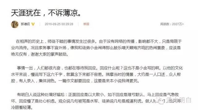我就说郭德纲对曹云金的指控不会哑火的,他只是在酝酿,酝酿了20天,发个大招,而且今后的岁月里,他会时时提起曹的背叛,无论公开还是私下。这对师徒,彼此都恨毒了对方。