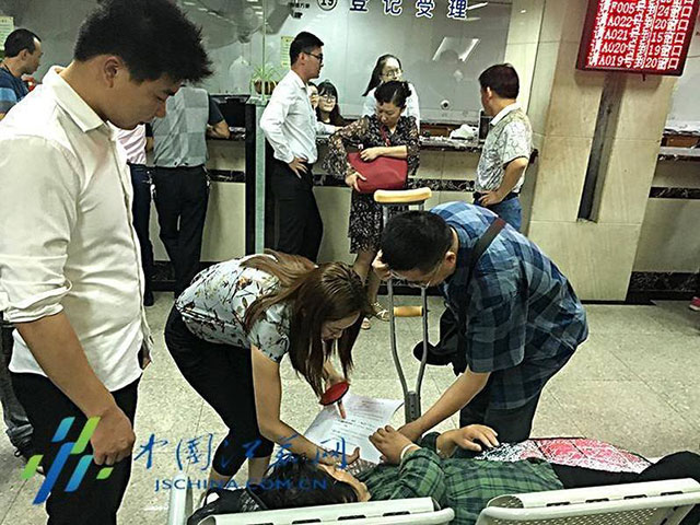 南京房产交易中心出现感人一幕:患病市民拄拐来到现场,由于腰部不适,躺着按手印。