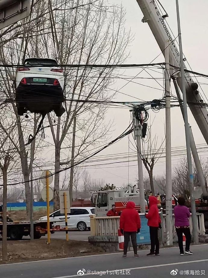 之前有一个是因为电线掉下来了,车将电线卷入车底,电线又将车带到空中的。