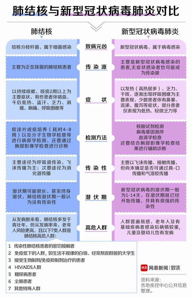 同样是呼吸道传染病,同样会对肺部造成损伤甚至致死,肺结核和新型冠状病毒肺炎相比,主要差异在于,肺结核是细菌感染,而新型冠状病毒肺炎属于病毒感染,在病理上有着根本差别。