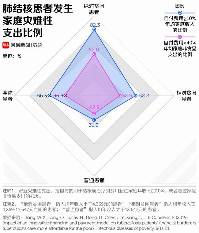 根据学者研究,"绝对贫困"(年收入低于4369元)的肺结核患者发生灾难性支出的比例是82.3%,"相对贫困"(年收入为4369元至12647元)的患者发生灾难性支出的比例是52.2%,而普通患者发生灾难性支出的比例也达到了31%。[6