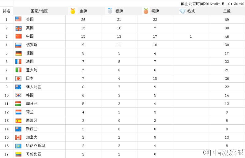 【今日榜单】本届里约奥运会开赛至今,中国代表团收获15金13银17铜1钻戒,居奖牌总榜第二,其中金牌第二,银牌第三,铜牌第二,钻戒第一。