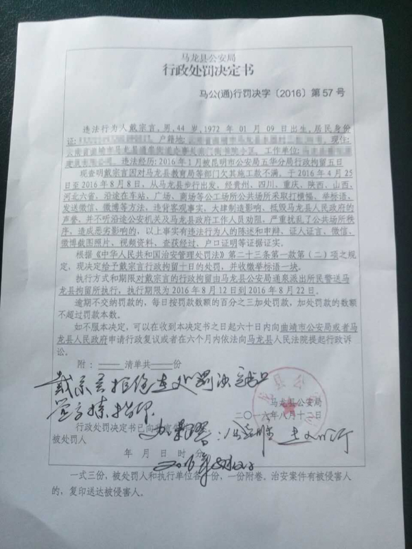 曲靖男子徒步6省市讨要工程款,“诋毁政府声誉”被拘10日。为讨要330万元学校工程建设欠款,曲靖市马龙县男子戴克健徒步六省市,准备以“徒步讨债中国行”的方式,讨要当地教育局等部门欠其的学校建设工程项目欠款。但8月12日,他的这一行为因“诋毁马龙县政府声誉、不听政府工作人员劝阻、严重扰乱了公共场所秩序”,被马龙县公安局给予行政拘留10日的处罚。(8月15日《春城晚报》)
