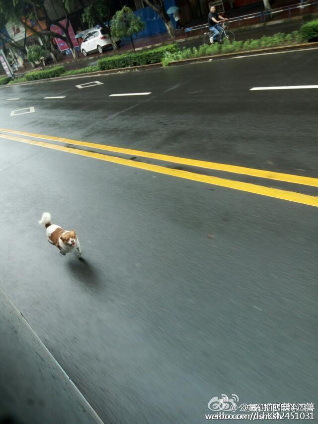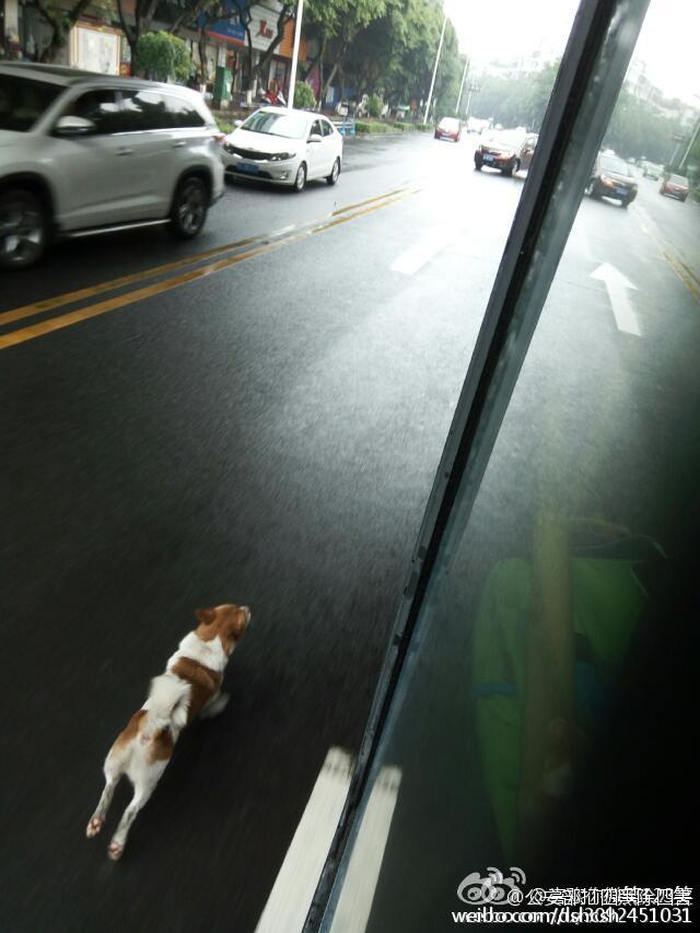 【网曝狗狗不能上公交 紧追公交半小时】4日下午,四川乐山一位网友乘坐公交车时拍下这样一幕:因公交不让带宠物,狗狗的主人有事也不能下车,随后半个多小时的车程,狗狗一直在马路上奔跑,一路追着公交车跑…不少网友直呼心疼狗狗,表示这样做既危险又影响交通。
