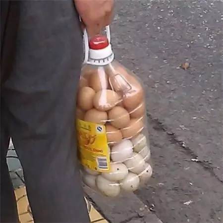 鸡蛋易碎,用油桶装,不仅能保护鸡蛋,拎起来还非常方便,不怕风不怕雨,劳动人民真是太智慧了!