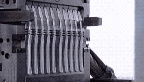 工业上最普遍的塑料加工方法是「喷射成型」:先把塑料颗粒熔化了,用注射成型机一次性全打进牙刷柄的模具里,「吧嗒」一下射出的塑料就成型.10.支牙刷了。