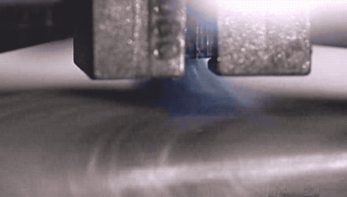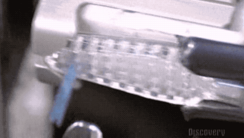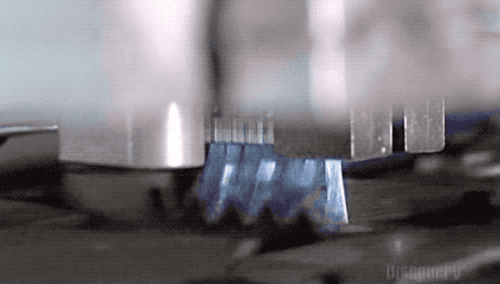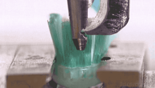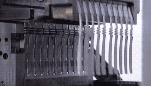 这是超慢镜头下的植毛过程,刷毛被转盘送到以后是要被对折着被送进牙刷头的凹槽里。