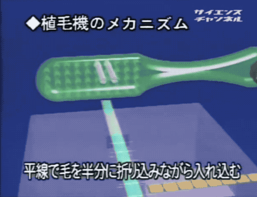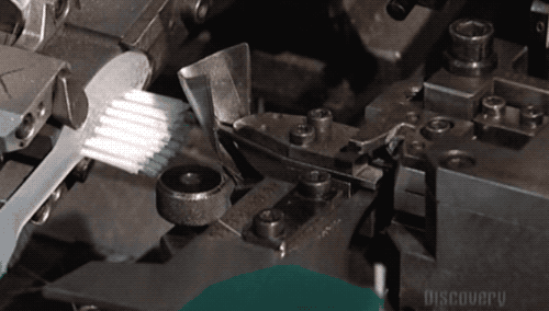 慢动作下看到机器夹子把对折的刷毛塞进槽里...