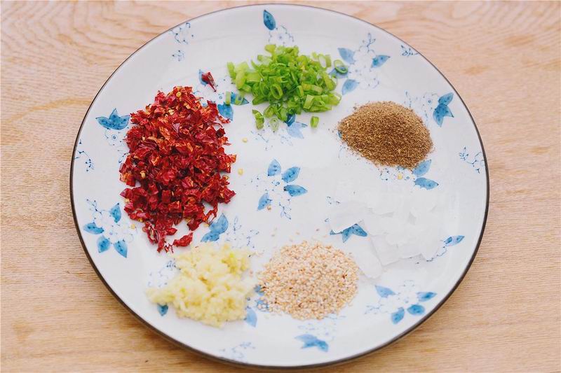 配料:花椒粉、辣椒粉、大蒜、盐、菜籽油、香葱、二荆条干辣椒、冰糖、孜然粉、白芝麻、红薯淀粉