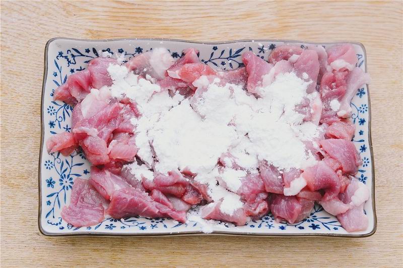2肉切成片,加入盐与淀粉搅拌均匀,腌制10分钟