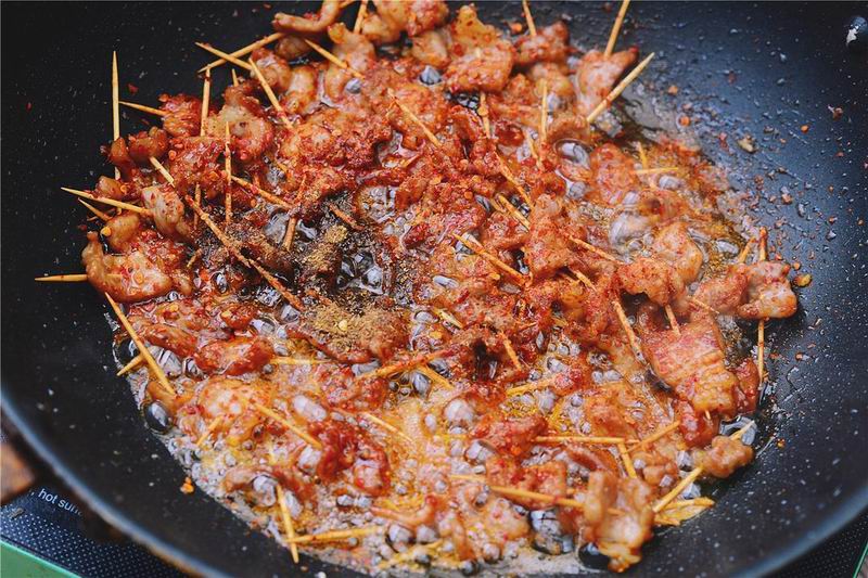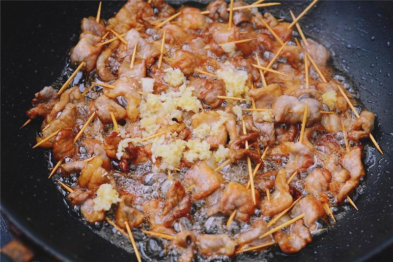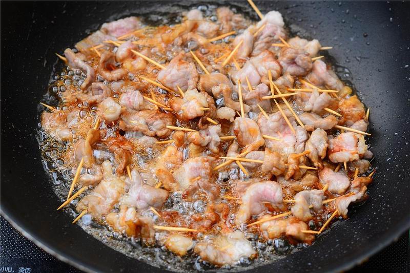 4起油锅,倒入较多油,加入冰糖,融化变色后加入肉串,转中火炸