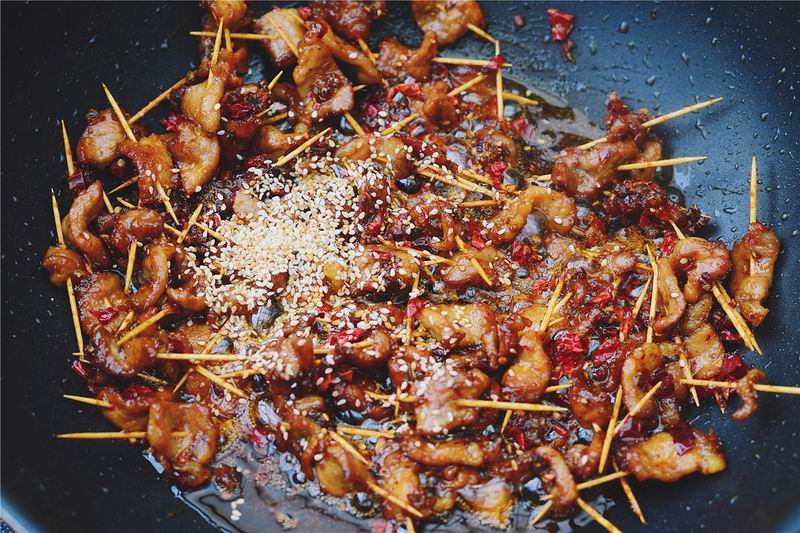 9直到肉串水分更干,表面微焦,加入白芝麻