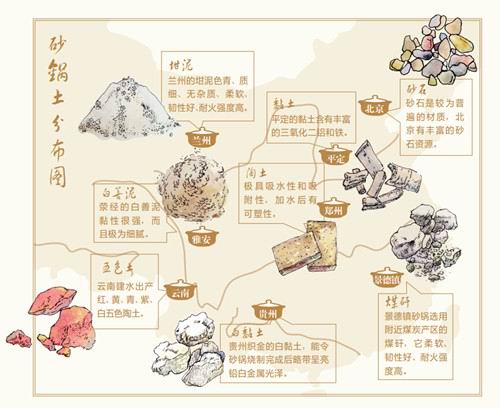 景德镇周边有煤炭,砂锅便就地取材。兰州的坩泥质地粗鄙,用它制出的砂锅被称为"丑砂锅"。北京最早有砂锅,也因为门头沟有丰富的砂石资源。