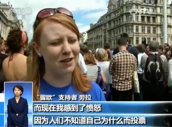 因不满公投结果,25日下午,英国民众在英国议会前自发举行集会,抗议英国“脱欧”。不少人举着“我爱欧洲”、“我希望留下来”等标语。有人民众表示,这次公投是个巨大的错误,很多人被政客的谎言所欺骗,因而投出了“脱欧”的一票。还有人说,“人们都不知道自己为什么而投票”,“我们让自己成为了世界的笑柄”。