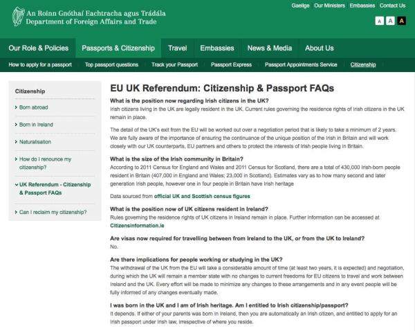 △爱尔兰外交部网站发布的关于英国人申请爱尔兰护照的问题指南。