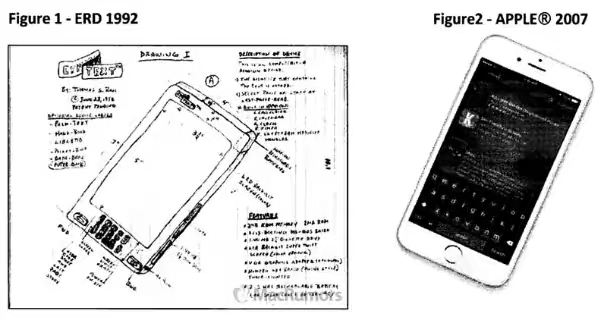 上面是他的设计图和 iPhone 的对比图。看起来的确有几分相似。在起诉书里,他表示自己设想的是一款这样的设备: