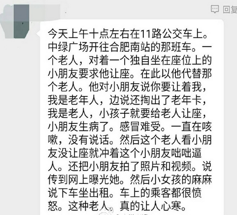 恰恰就在上海市政府用发放现金贴补等方式率先取消70岁以上老人免费乘座公交规定引起公众高度关注后没几天,根据安徽商报消息,网友7月2日上午10点左右在中绿广场开往合肥南站11路公交车上。一个老人,对着一个独自坐在座位上的小朋友要求他让座。他对小朋友说:你要让着我,我是老年人,边说还掏出了老年卡,小孩子就要给老人让座!小朋友生病了,感冒难受。一直在咳嗽,没有说话。然后这个老人看小朋友没让座就冲着这个小朋友咄咄逼人。当时该母亲被这个老人的辱骂气的直抖,然后说要下车!老人听到了就说:你们快滚下车吧,像你们这样不知道尊敬老人的快点滚吧。