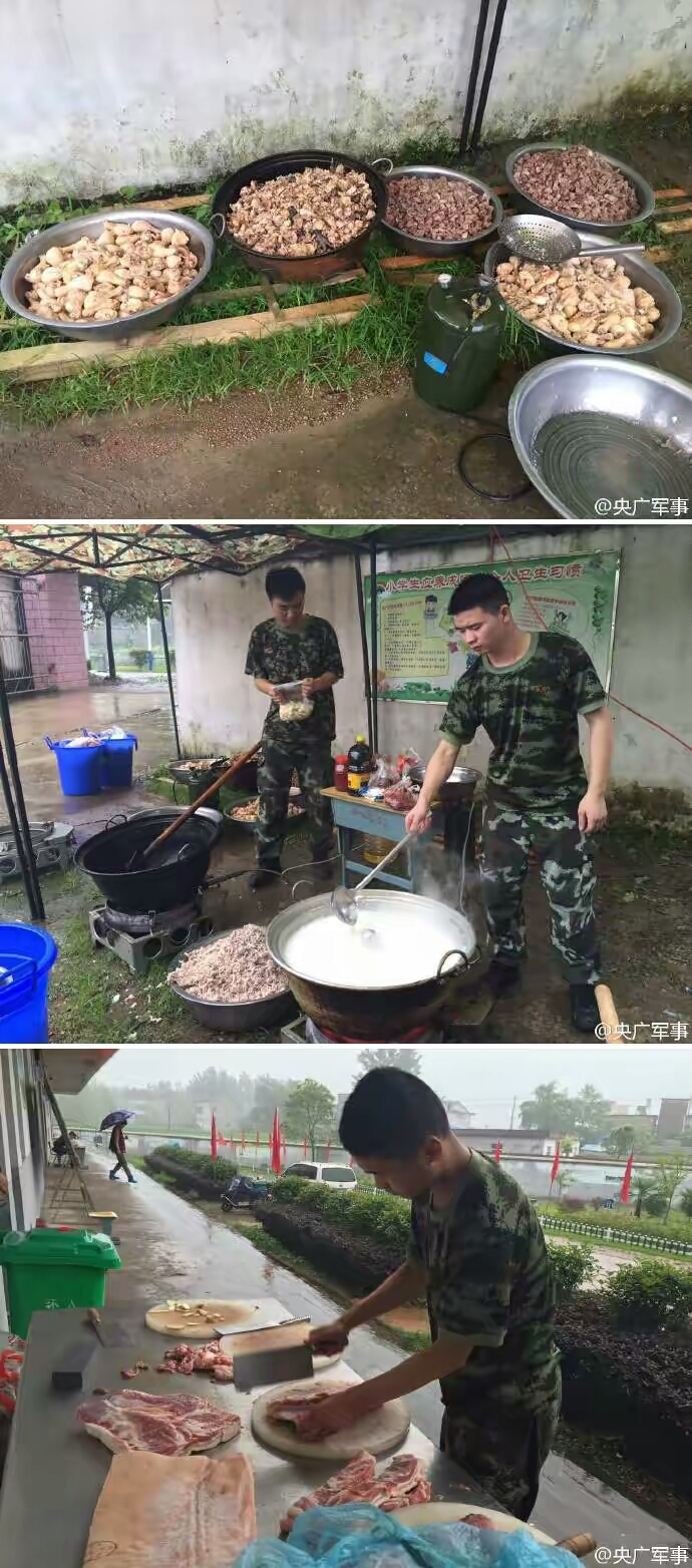 【现场图:抗洪一线部队伙食保障】@央广军事:武警合肥支队在抗洪前线为官兵精心调配伙食——早餐有面包鸡蛋牛奶,午晚餐保证六菜一汤,餐餐有水果。确保官兵在前线战斗时吃得营养、吃得科学,补充战斗力,为打赢抗洪战斗提供强大动力。