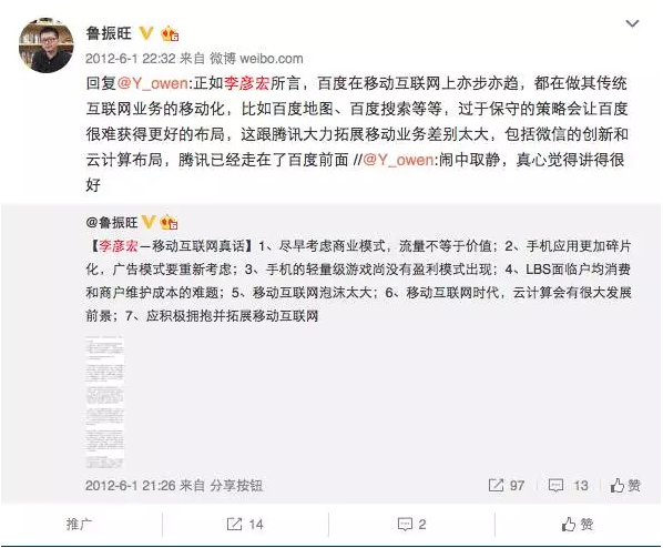 当时他刚发表了这个著名的演讲,我就在微博点评了:百度的移动战略其实是亦步亦趋,也就是简单实现传统互联网业务的移动化,过于保守,很难获得更好的布局,跟腾讯大力拓展移动业务的差距太远。