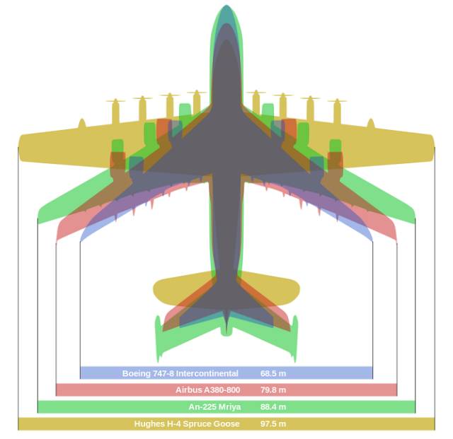 直到今天,H-4还是史上翼展最宽的飞机(97.5米),比“空中巨无霸”A380都大得多