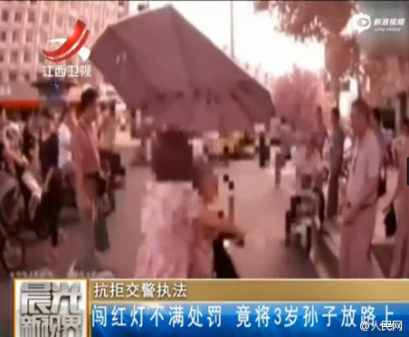 【女子闯红灯不满处罚 竟将3岁孙子放路上抗法】近日,江苏徐州,一女子骑车闯红灯被交警拦下。因不满交警的处罚(站岗20分钟或罚款20元),该女子竟将3岁的孙子放在马路中央,最后在市民的劝解下,该女子才离开。(江西卫视)