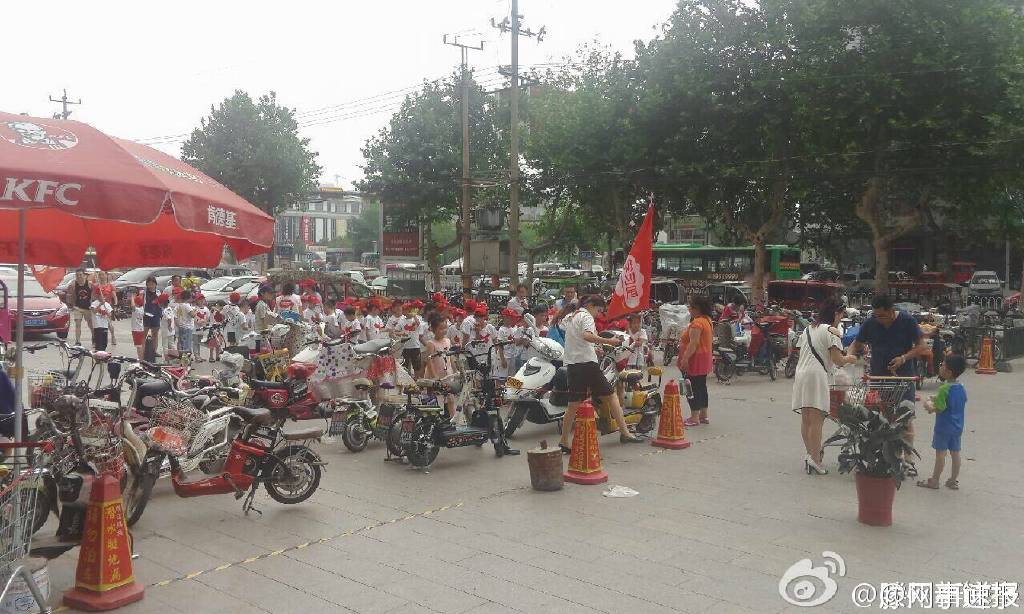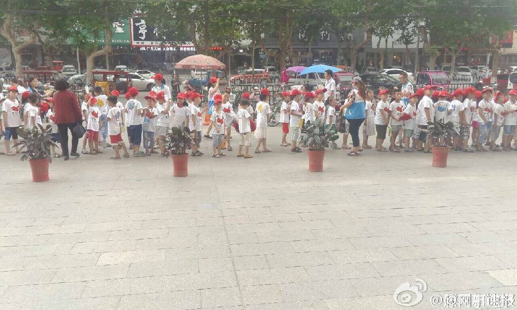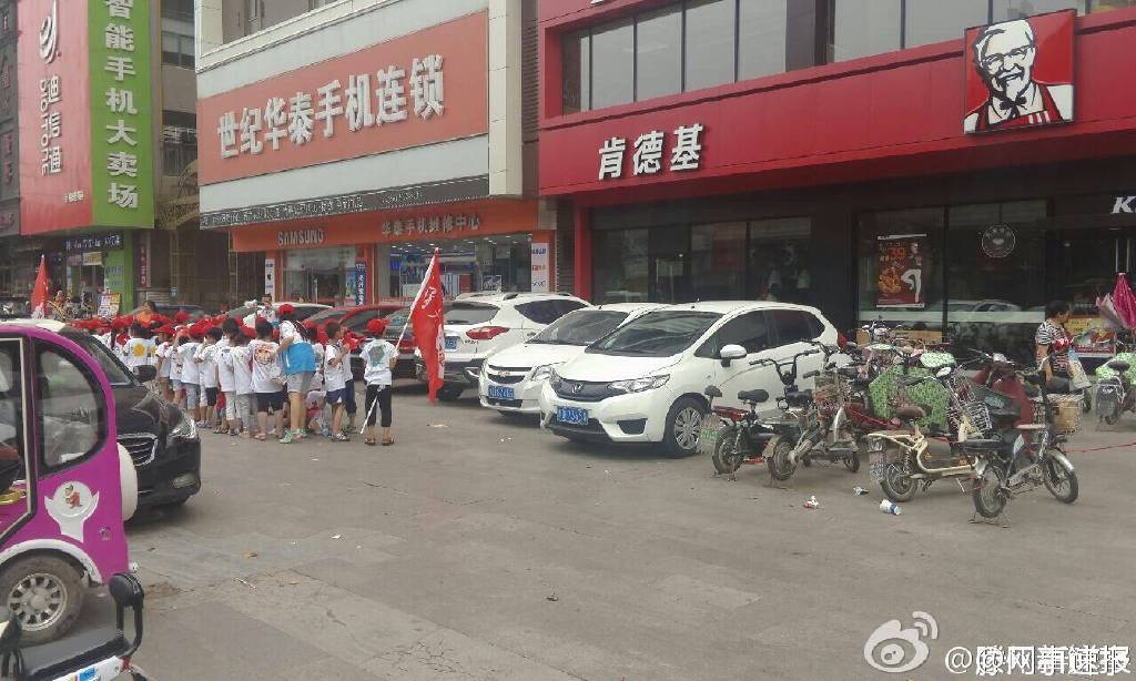 @滕州新鲜事 :今天(7月19日),贵诚肯德基门口出现一群小学生,在老师带领下对着肯德基大喊“中国万岁,抵制美货,中国一点儿也不能少”口号,引起路人围观。图为举着红旗的小孩子们。(@网事速报)