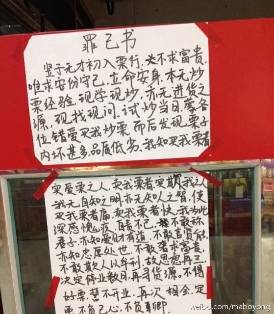 @马伯庸 :常去的炒栗子店突然歇业,留下这么一张告示.....