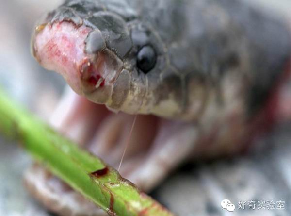 蝮蛇忽然张开嘴巴,狠狠咬住了竹竿,毒牙上渗出毒液。直到20分钟后,蛇头才彻底不动了。