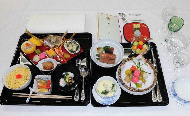 前菜(左上角扇形漆盘):烤小鲷鱼.盐蒸鲍鱼.铁扇虾.柚子锅三文鱼籽.鮟鱇鱼肝.烧锦鸭.百合根.栗子.黄瓜